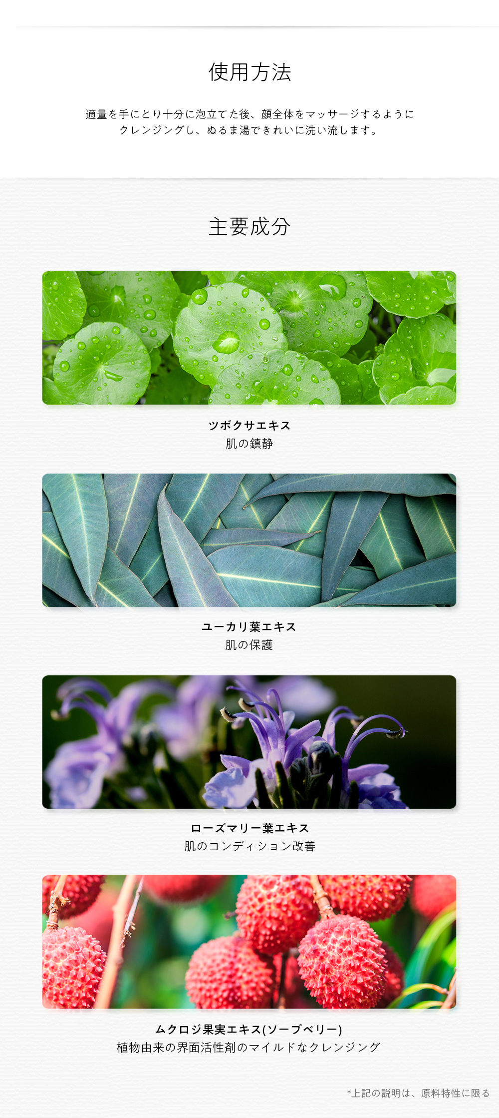 水、グリセリン、ココイルイセチオン酸Na、ジグリセリン、ヤシ脂肪酸、プロパンジオール、ステアリン酸グリセリル、ココイルメチルタウリンNa、ラウラミドプロピルベタイン、イセチオン酸Na、ココイルグリシンK、香料、ヤシ脂肪酸K、ポリクオタニウム-67、カプリリルグリコール、クエン酸、塩化Na、1,2-ヘキサンジオール、EDTA-2Na、エチルヘキシルグリセリン、ムクロジ果実エキス、パンテノール、ローズマリー葉エキス、酢酸Na、BG、ジメチコン、シクロメチコン、ツボクサエキス、フェノキシエタノール、酢酸トコフェロール、マカデミア種子油、コレステロール、リノレン酸グリセリル、リノール酸グリセリル、コレス-24、セテス-24、シトステロール、PG、アラキドン酸グリセリル、ユビキノン、アラントイン、ナイアシンアミド、パルミチン酸レチノール、アスコルビルリン酸Na、セチルリン酸K、ユーカリ葉エキス、ビオチン