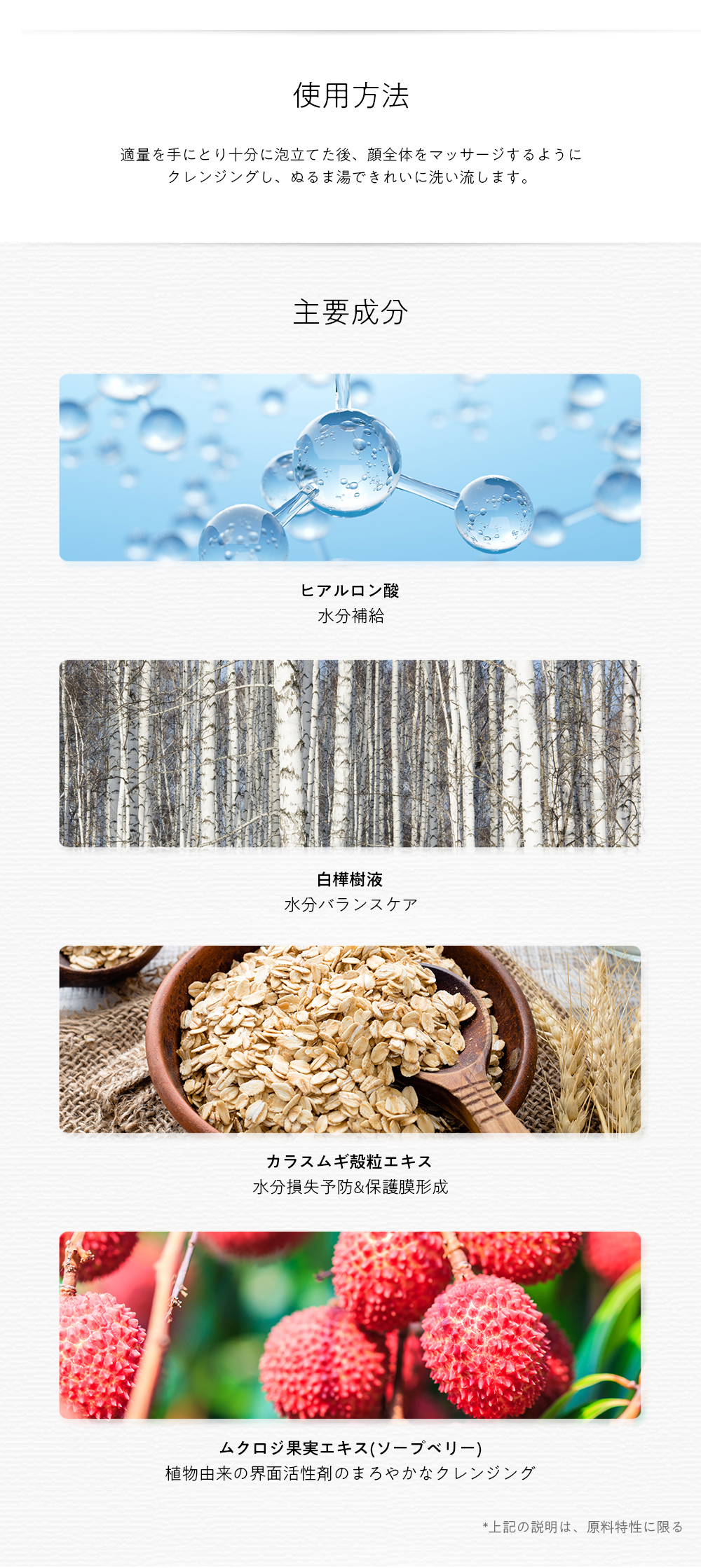 水、ラウリン酸、ミリスチン酸、ラウラミドプロピルベタイン、水酸化K、アクリレーツコポリマー、グリセリン、塩化Na、ジステアリン酸グリコール、安息香酸Na、香料、ソルビン酸K、ポリクオタニウム-7、EDTA-2Na、パルミチン酸、ラベンダー花水、シラカンバ樹液、ムクロジ果実エキス、BG、カラスムギ穀粒エキス、1,2-ヘキサンジオール、アロエベラ葉エキス、ヒアルロン酸Na、ジメチコン、シクロメチコン、フェノキシエタノール、マカデミア種子油、酢酸トコフェロール、コレステロール、リノレン酸グリセリル、シトステロール、コレス-24、リノール酸グリセリル、クエン酸、セテス-24、アラキドン酸グリセリル、パンテノール、PG、ユビキノン、ナイアシンアミド、アスコルビルリン酸Na、パルミチン酸レチノール、セチルリン酸K、ビオチン